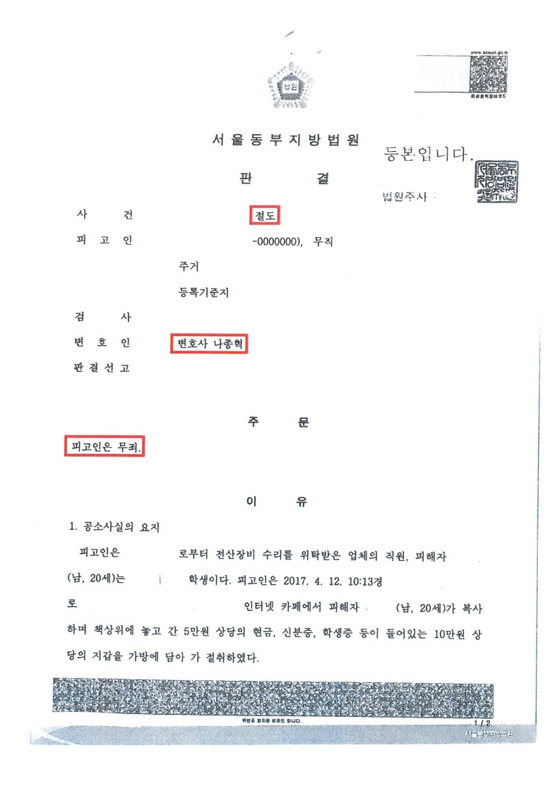 저희 변호인이 여러 정황증거 등을 제출하면서 의뢰인의 억울함을 호소한 결과, 이 사건에서 의뢰인의 고의와 불법영득의사가 없다고 판단되었고 결국 무죄 판결을 받을 수 있었습니다.